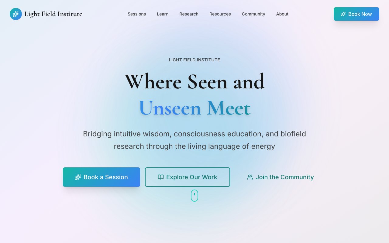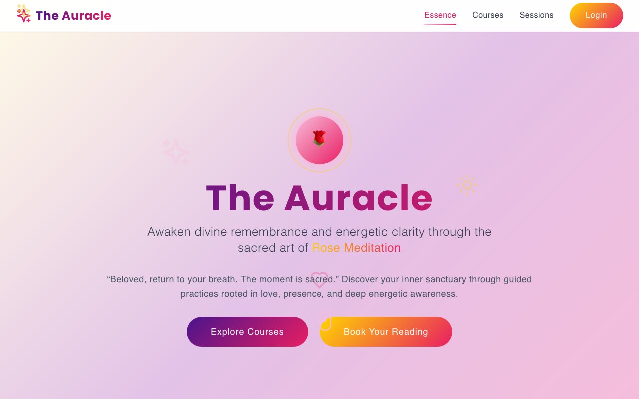 Digital ecosystem bridging intuitive wisdom and consciousness education. Features aura readings, energy sessions, courses, session packages, weekly field notes, and Practice/Education sections.
