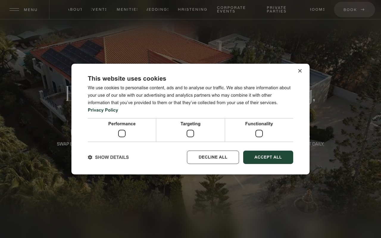 Private estate in Larnaca for weddings and milestone celebrations. Features Mediterranean gardens, glass ballroom, 10 rooms/suites, event planning, catering connections, and carbon offsetting.