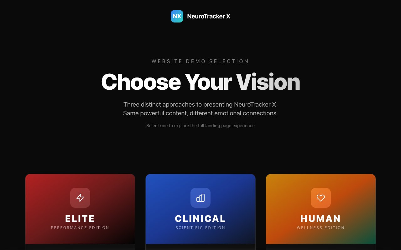 Platform for cognitive training to enhance human performance. Features three demo editions: ELITE, CLINICAL, and HUMAN, providing comprehensive cognitive enhancement solutions for different user needs.