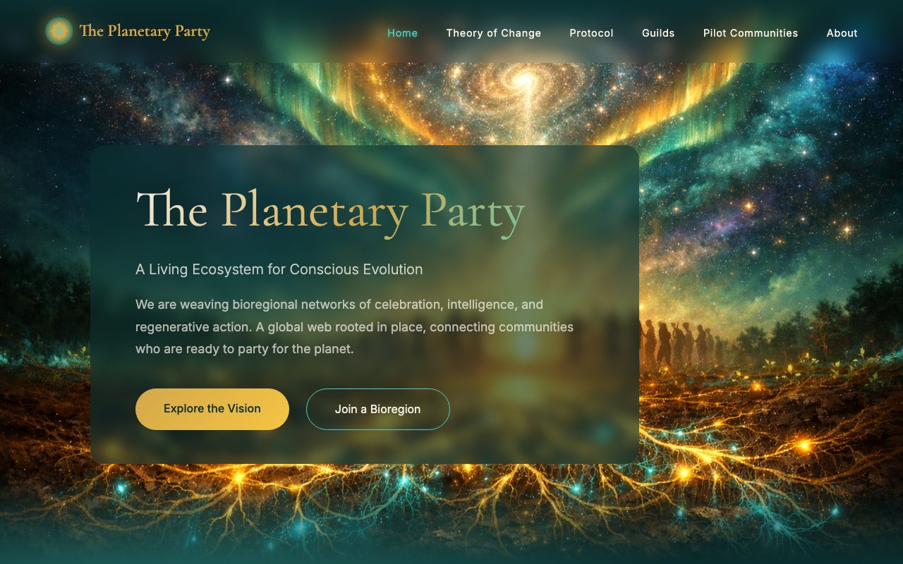 Global web of bioregional networks for celebration and regenerative action. Features protocols, tools, Flow Funds, guilds, bioregional dashboards, Five-Phase Protocol, and node exploration.